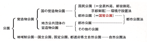逆に、都市公園以外の公園としては、皇居外苑や新宿御苑などの「国民公園」、富士箱根伊豆国立公園などのような「地域制公園」があります。それぞれ、国民公園は環境庁設置法(国民公園制定時、現・環境省)、地域制公園は自然公園法に基づくもので、都市公園は都市公園法に基づいて設置されます。