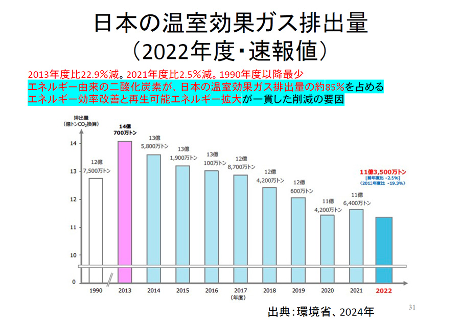 日本のGHG排出量は徐々に減少しており、このままのペースでいくと2030年度には40%削減(2013年度比)を達成できるくらい順調に進んでいる。当然、対策をとっているから削減されているのであって、今後、さらにどういう対策を追加していくかが非常に重要になる。