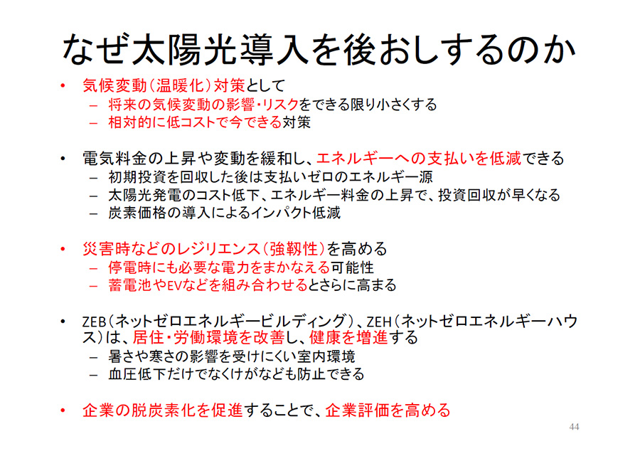 太陽光発電の導入を推進する理由、まず1つは気候変動対策。将来の気候変動の影響・リスクを小さくしていく。特に建物由来の排出を減らしていくというのは非常に重要である。