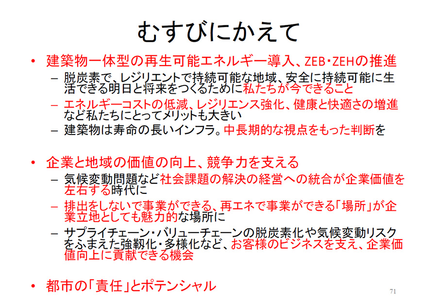 例えば戸建て住宅に太陽光発電や風力発電の設備をどのように置くか。今回の東京都の条例改正においても、建築物を上手く使っていくことがポイントになる。