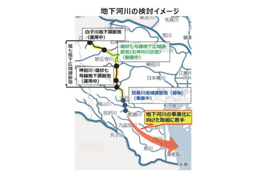 また、強靭で持続可能な都市の実現を目指して2022年に策定、2023年にアップグレード版を発表した「TOKYO強靭化プロジェクト upgrade Ⅰ」では、複数の地下調節池を連結して東京湾までつなぐ“地下河川”の整備に向けた検討に着手する方針を掲げています。