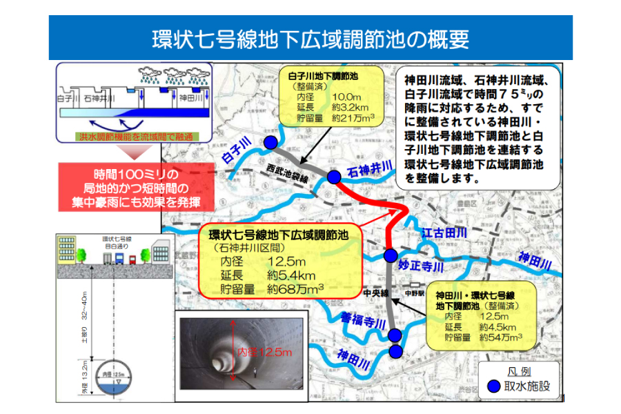 東京都内を東西に流れる神田川・石神井川・白子川の流域では現在、すでに稼働している「神田川・環状七号線地下調節池」と「白子川地下調節池」を連結する形で、「環状七号線地下広域調節池(石神井川区間)」の建設工事が進行中です。