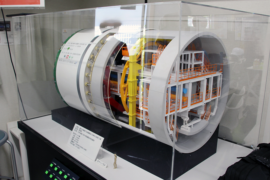 現在は、発進立坑から1.4kmほど進んだところでカッタービットの交換作業を行っており、掘削作業は一時的に中断しています。