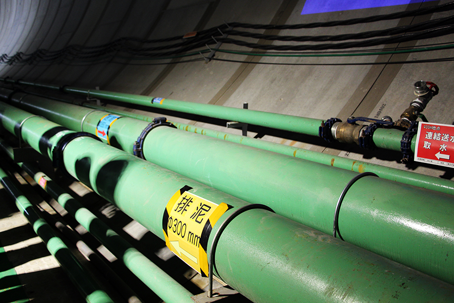 内壁に沿って設置されているこちらの緑の管は、泥水式シールド工法でシールドマシンに泥水を送る送泥管と、掘削した土砂などを搬出する排泥管です。