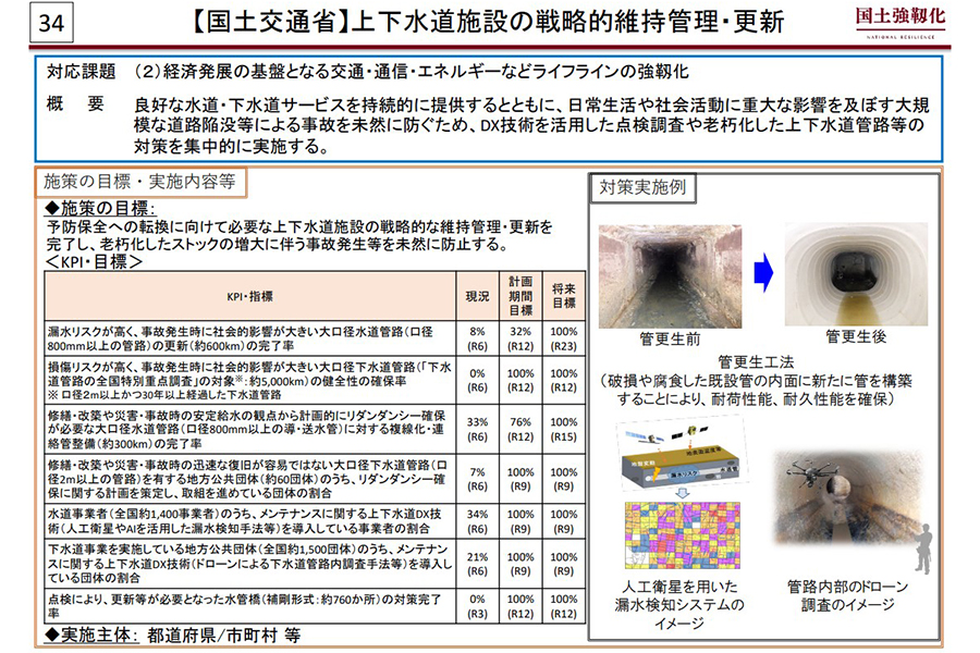 八潮市の事故を受け、国土交通省は全国の自治体に要請して下水道管路の全国特別重点調査に着手しました。調査対象は、損傷リスクが高く、万が一事故が発生すれば重大な影響を及ぼすであろう大口径の下水道管路。具体的には口径2m以上かつ設置から30年以上経過したもので、総延長は約5,000kmにおよびます。調査結果に基づき、必要な箇所にはメンテナンスを施していく予定です。