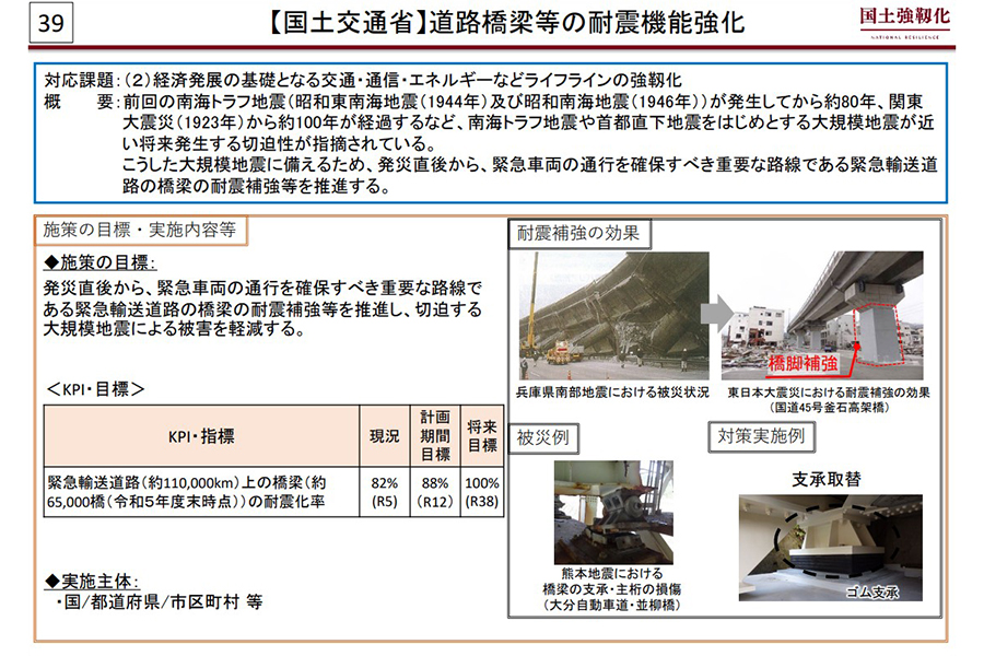 また、災害対応の生命線となる緊急輸送道路上の橋梁は、老朽化対策だけでなく、地震に耐えられるよう耐震化も図っていく予定です。