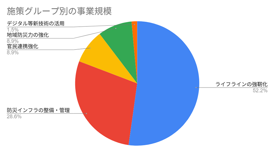 5つの施策グループの中でも、「ライフラインの強靭化」の事業規模は約10.6兆円と、全体の半数以上を占めています。