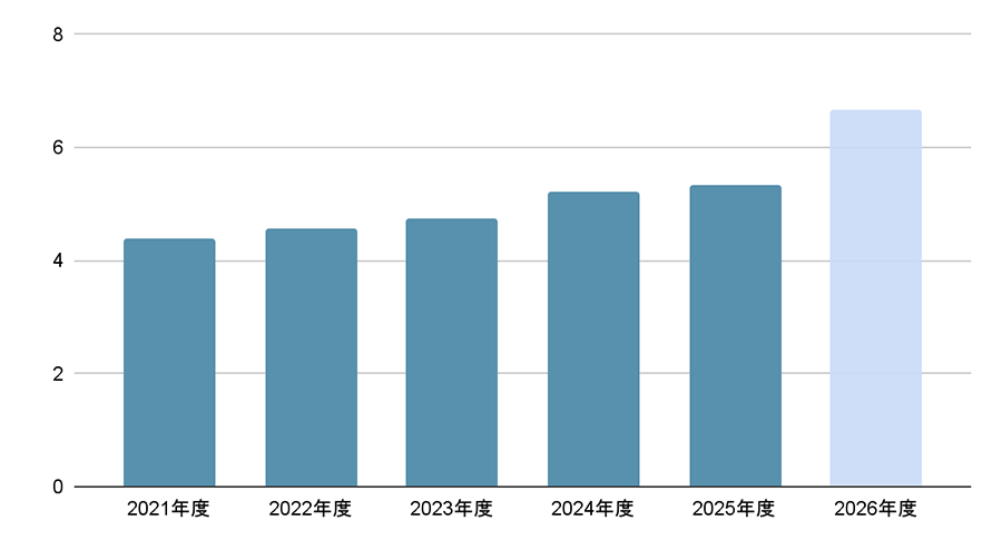 直近5カ年(2021年度から2025年度)の国土強靭化関係予算は、右肩上がりで増えています。次のグラフは各年度の当初予算における国土強靭化関係予算の推移を表しています(2026年度分は概算要求額)。