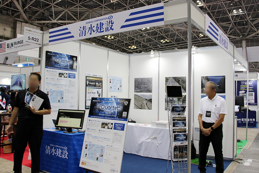 「土木・建設DX/システム/ツール展」には大手ゼネコンの清水建設株式会社のブースも。同社宇宙開発部と東京海洋大学の共同開発による独自技術を用いたGNSS動態観測システム『QuartetS(カルテットエス)』を紹介していました。