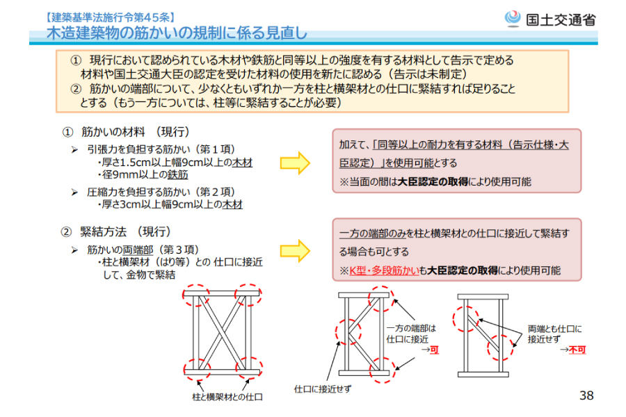 また、筋交いの取り付けに関する規定にも変更点があります。以前は筋交いの“両端部”を柱と横架材との仕口に接近させて緊結する必要がありましたが、改正後は国土交通大臣の認定を受けた構造や工法に限り、“片側の端部のみ”が仕口に接近して緊結する、アルファベットの「K」のような形状の筋交いも使用可能となりました。