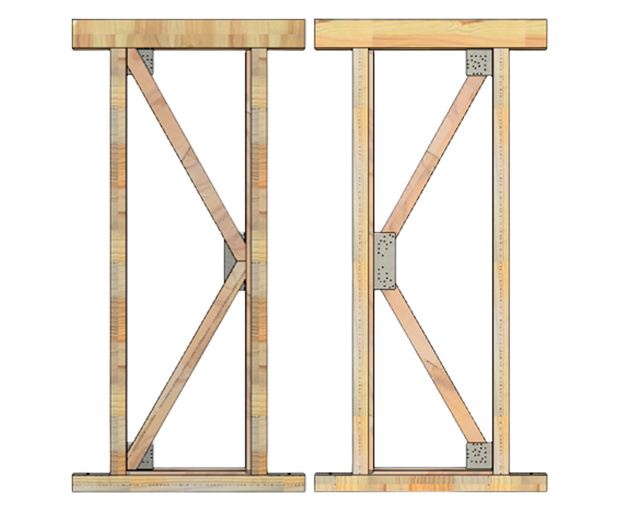 HW5.0Σのもう1つの特長は部材のシンプルさ。接合部の金物3点と斜材2本のみで壁倍率5.0の高耐力を実現しているため、施工の手間を省力化、斜材は1本約1.5mと短く、取り付けは1人で作業して1カ所あたり20分程度でできるといいます。木材の使用量も抑えられるのでコストダウンにもつながります。