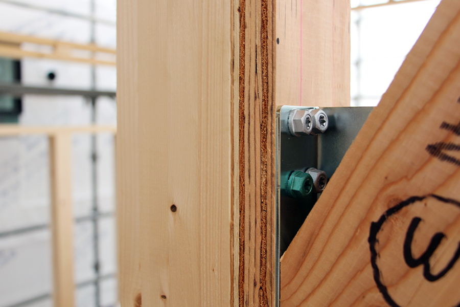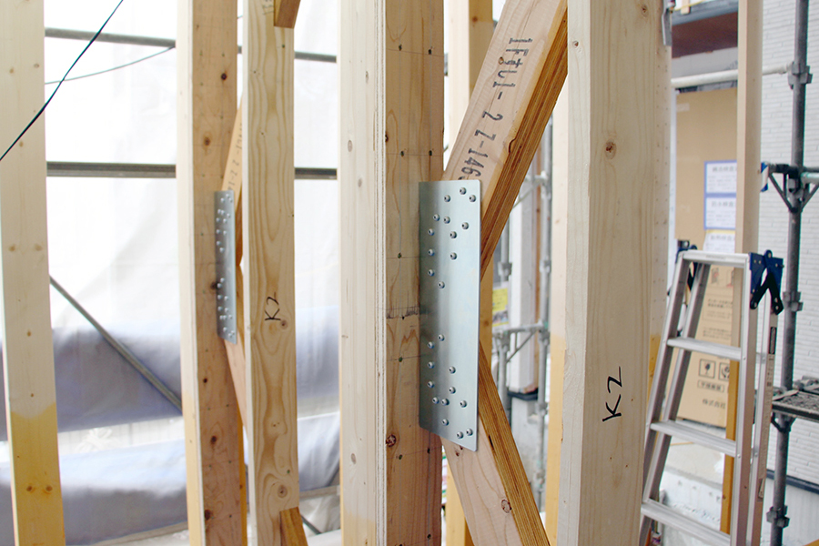 なお、添え間柱と斜材はLVL(単板積層材)という合板でできており、添え間柱はB種LVL(スギ)、斜材はA種LVL(カラマツ)のプレカット材を使用しているそうです。
