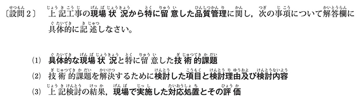 - 設問1:実際に経験した工事における「品質管理」について記述