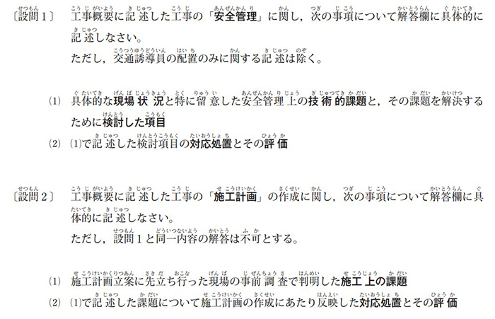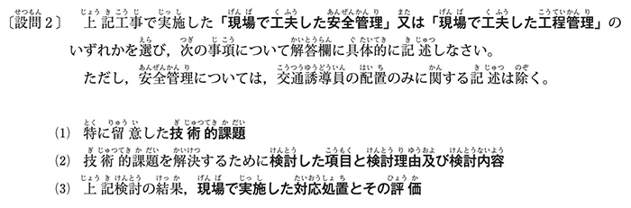 同じ工事を題材にして、「安全管理」と「施工計画」という2つの異なる観点から記述する問題になりました。