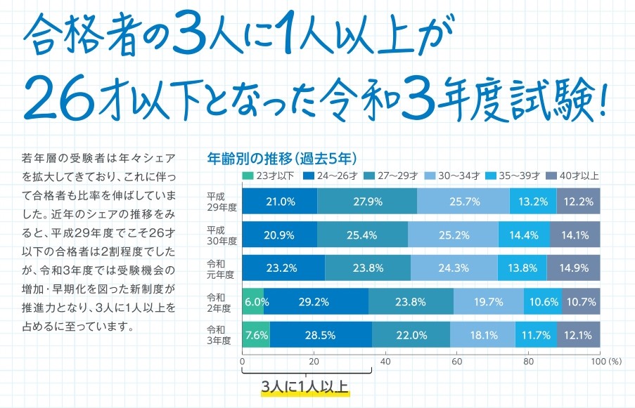 受験時の実務要件がなくなったことを追い風とし、令和3年度の試験合格者の3人に1人以上が26才以下という結果になっています。改正前には5割に届かなかった20代の合格者割合ですが、令和3年には58.1%となり、2年連続で6割近い数値となりました。