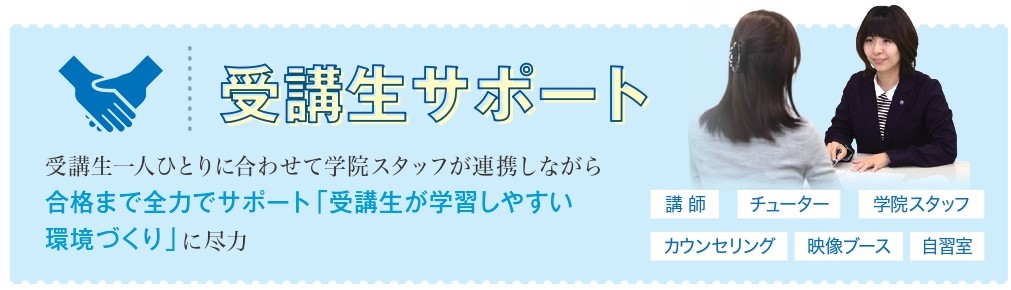 試験までの道のりは、決して平坦な道のりではありません。受講生のモチベーションと学習を持続させる「ペースメーカー」として、挨拶や講習連絡などきめ細かに配慮し、親しみやすく気持ちよく学習していただける環境がつくられています。