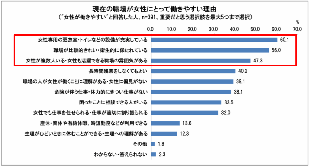 現在の職場で”女性が働きやすい”(「働きやすい」と「どちらかといえば働きやすい」の合計)と回答した人に、その理由を尋ねたところ、多く挙げられた回答は、「女性専用の更衣室・トイレなどの設備が充実している」60.1%、「職場が比較的きれい・衛生的に保たれている」56.0%、「女性が複数人いる・女性も活躍できる職場の雰囲気がある」47.3%でした。