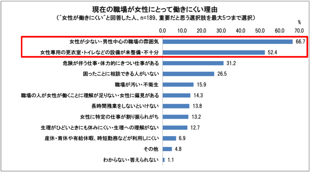 現在の職場で“女性が働きにくい”(「働きにくい」と「どちらかといえば働きにくい」の合計)と回答した人に、その理由を尋ねたところ、多く挙げられた回答は、「女性が少ない・男性中心の職場の雰囲気」66.7%、「女性専用の更衣室・トイレなどの設備が未整備・不十分」52.4%でした。