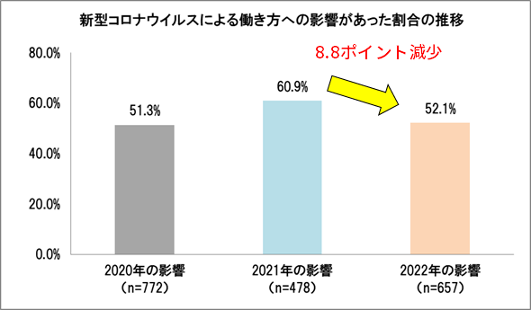 新型コロナウイルスが働き方に与えた影響は2022年は前年より減少