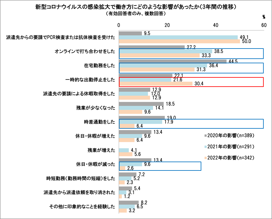 新型コロナウイルスの感染拡大が働き方に与えた影響の結果を、2021年と2022年とで影響すると、前年より5ポイント以上減少した項目は、「オンラインで打ち合わせをした」(5.2ポイント減)、「在宅勤務をした」(5.1ポイント減)、「時差通勤をした」(11.5ポイント減)、「休日・休暇が減った」(7.0ポイント減)。一方、「派遣先からの要請でPCR検査や抗体検査をした」は前年と同水準(0.9ポイント増)でした。また、国内で感染者が過去最大となったオミクロン株の感染拡大の影響だと思われますが、「一時的な出勤停止」は前年より増えました(8.8ポイント増)。この結果から、2022年は新型コロナウイルスの感染拡大が働き方に一定の影響を与えたものの、感染拡大に警戒しながら、働き方への影響を前年より減少させたと言えます。
