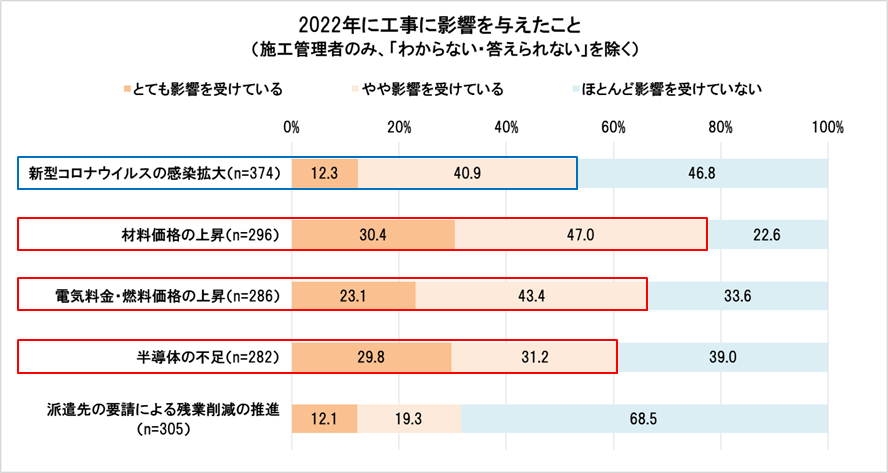 施工管理者のみに、2022年に下記の5つの要素が工事に影響を与えたかどうかを尋ねたところ、「とても影響を受けている」「やや影響を受けている」の合計が多い順から、「材料価格の上昇」77.4%、「電気料金・燃料価格の上昇」66.5%、「半導体の不足」61.0%、「新型コロナウイルスの感染拡大」53.2%、「派遣先の要請による残業削減の推進」31.4%でした。この結果から、「新型コロナウイルスの感染拡大」よりも「材料価格の上昇」、「電気料金・燃料価格の上昇」、「半導体の不足」の方が工事により大きな影響を与えたと言えます。