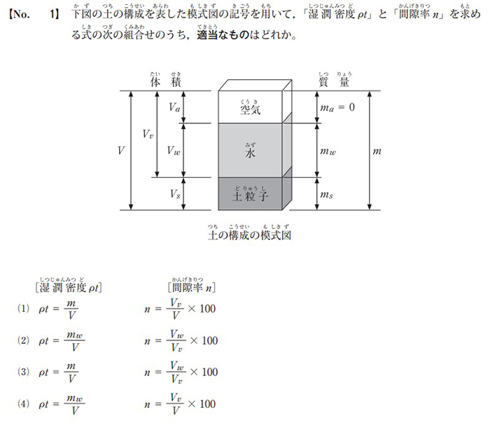 今年も1問目は土の3層構造に関する設問で、「湿潤密度ρt」と「間隙率n」が出題されました。