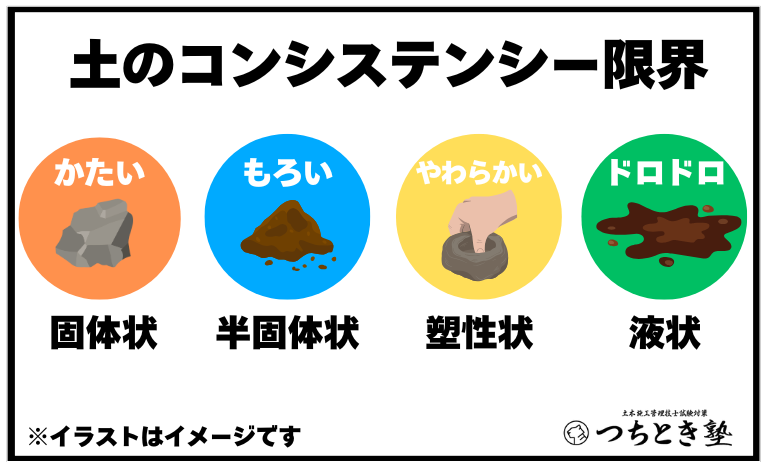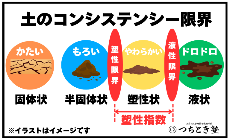 また、土が半固体状態から塑性状態に移るときの含水比を「塑性限界(Plastic Limit:PL)」と呼びます。