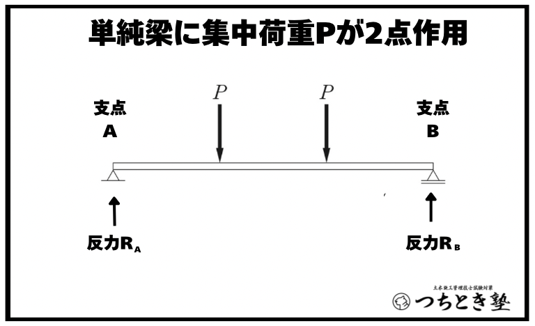 左右対称に荷重配置されているので、左右の支点反力は等しく[P]になります。