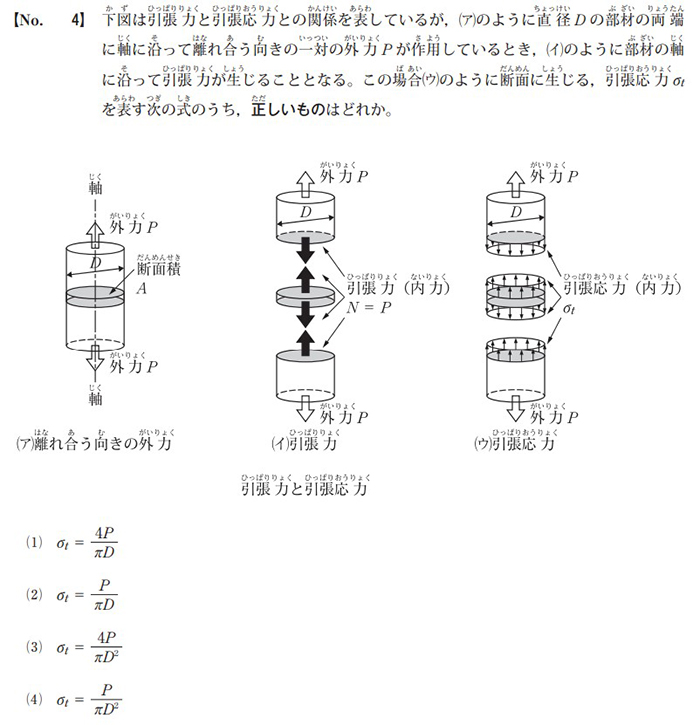 直径Dの円柱の両端に、軸方向に互いに引き離す向きの外力Pが作用しています。