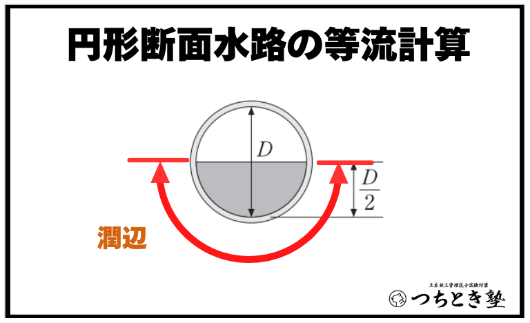 また、潤辺の長さは図のとおり、水路の円周の半分であるため、
