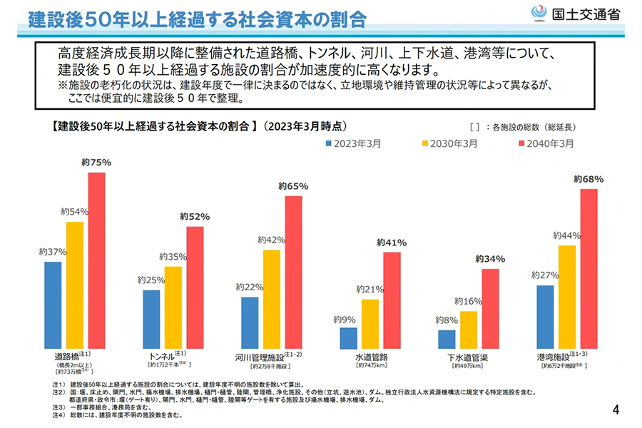 国土交通省の資料によれば、道路橋は2030年までに、トンネル・河川管理施設・港湾施設は2040年までに半数以上が建設から50年以上になる予定で、加速度的に増えていきます。比較的更新作業を行っている上下水道施設でも、2040年には40%前後が50年を経過します。