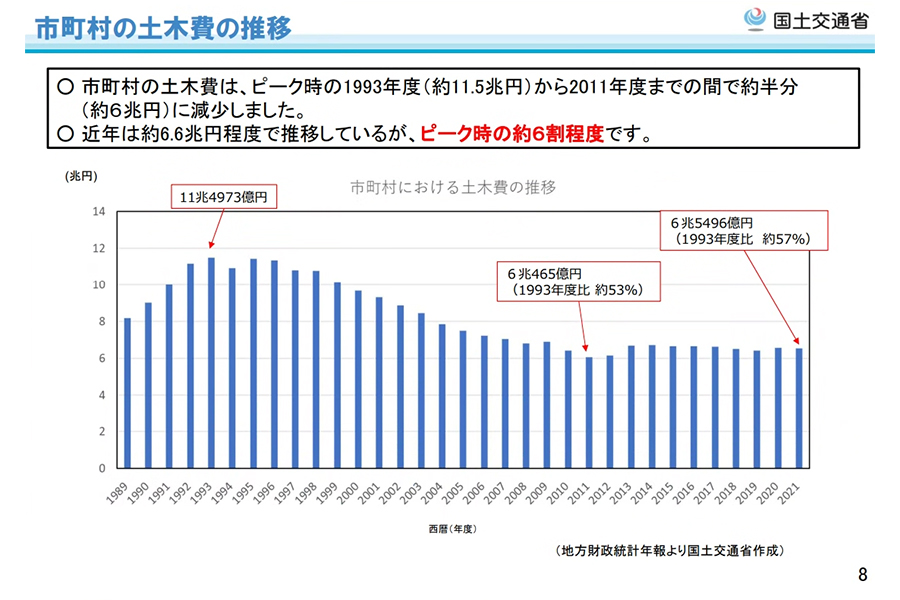 地方財政統計年報から国交省が作成した資料によれば、市町村の土木費は新設工事などもまだまだ多かった1993年度の11.5億円をピークに年々減少。2011年度に6兆円まで下がり、その後はほぼ横ばいの6.5兆円前後で毎年推移しています。
