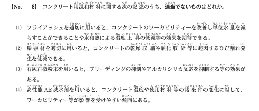 この中から骨材を中心に、セメント、混和剤、混和材について問われます。
