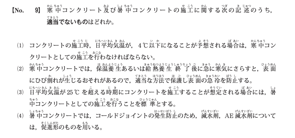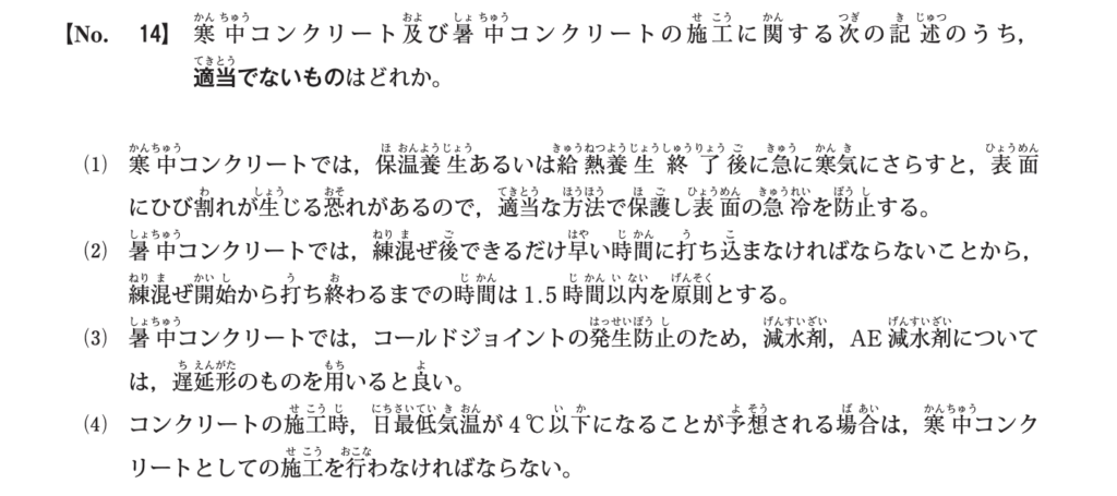 暑中コンクリートと寒中コンクリートは、令和4年度から3年連続で1問出題されています。