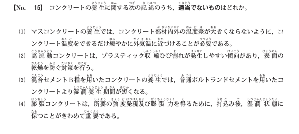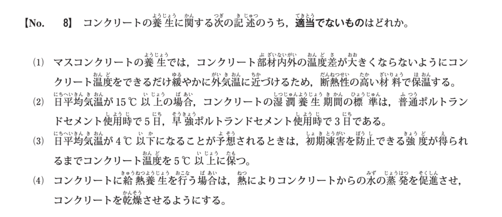 実際の試験問題では、コンクリートの養生について、養生の方法や日数などが問われています。