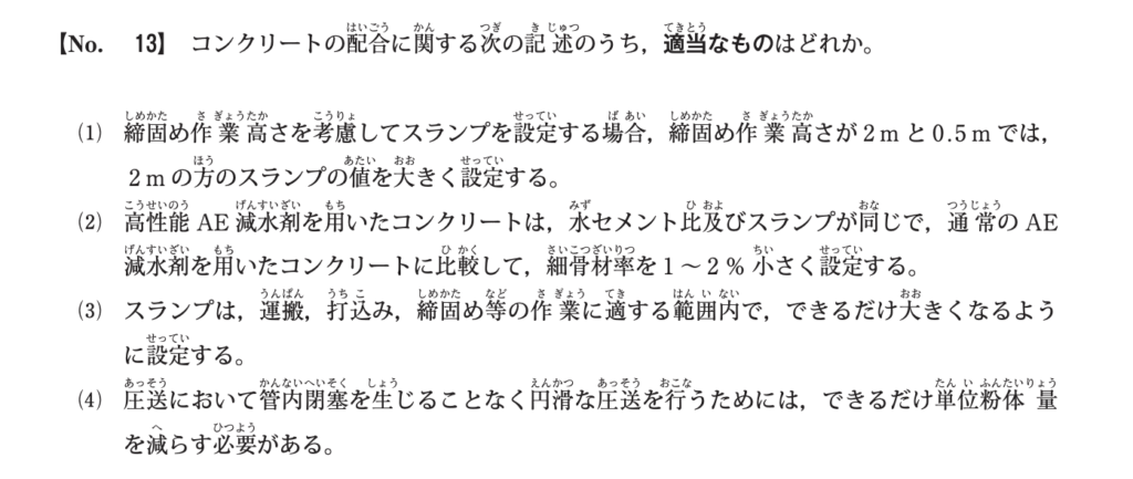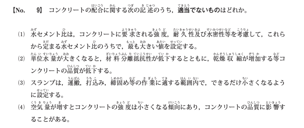 水セメント比、スランプ値の決め方、単位水量や単位セメント量が配合に与える影響など、コンクリート工の基礎の部分なので確実に押さえましょう。