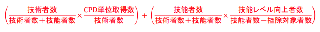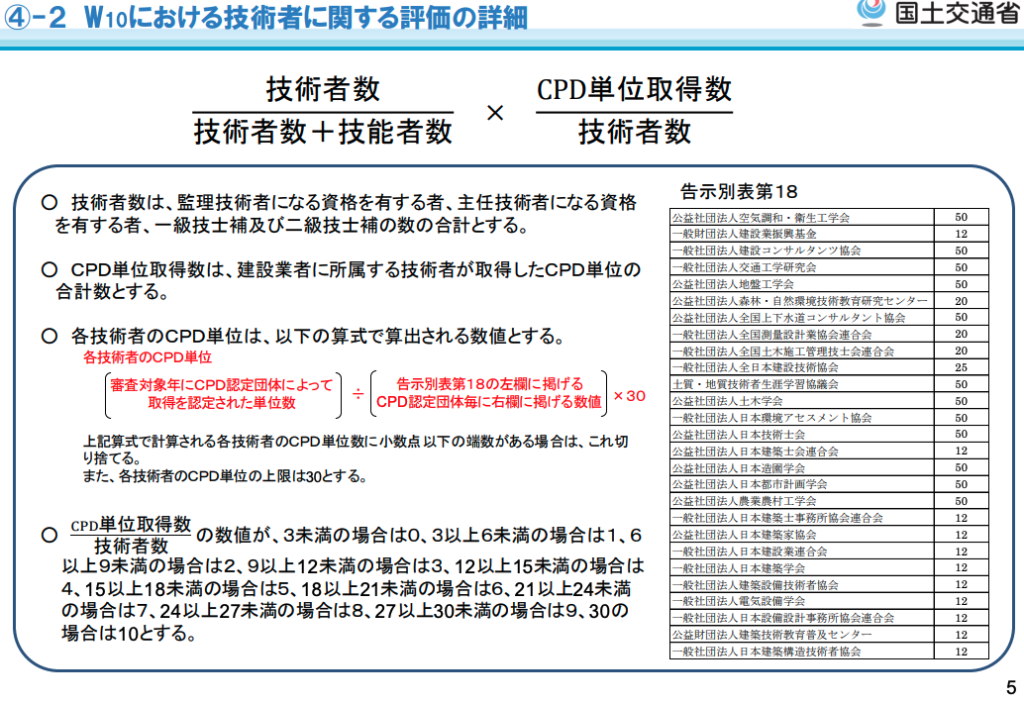 - 技術者:建設業者に所属する技術者が、審査基準日(決算日)以前1年間に取得したCPD単位の平均値で評価