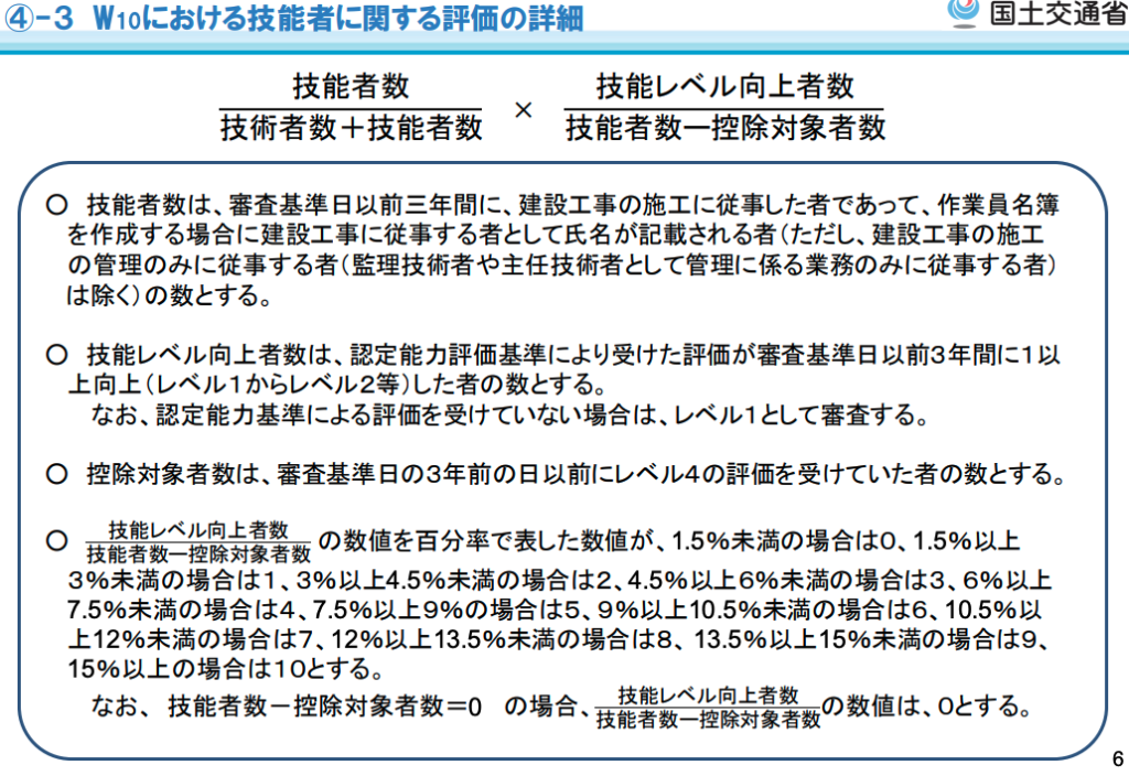 - 技能者:建設業者に所属する技能者が、認定能力評価基準により受けた評価が審査基準日(決算日)以前3年間に1以上(レベル1からレベル2等)向上した者の割合により評価