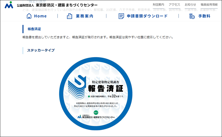 定期検査の報告を行うと『報告済証』が発行されます。エレベーターなどで、かご内にステッカーのようなものが貼られているのを見たことがある人は多いのではないかと思いますが、あれが報告済証です。しっかりと定期調査、定期検査を行っているという証であり、車でいう車検証のようなものですね。