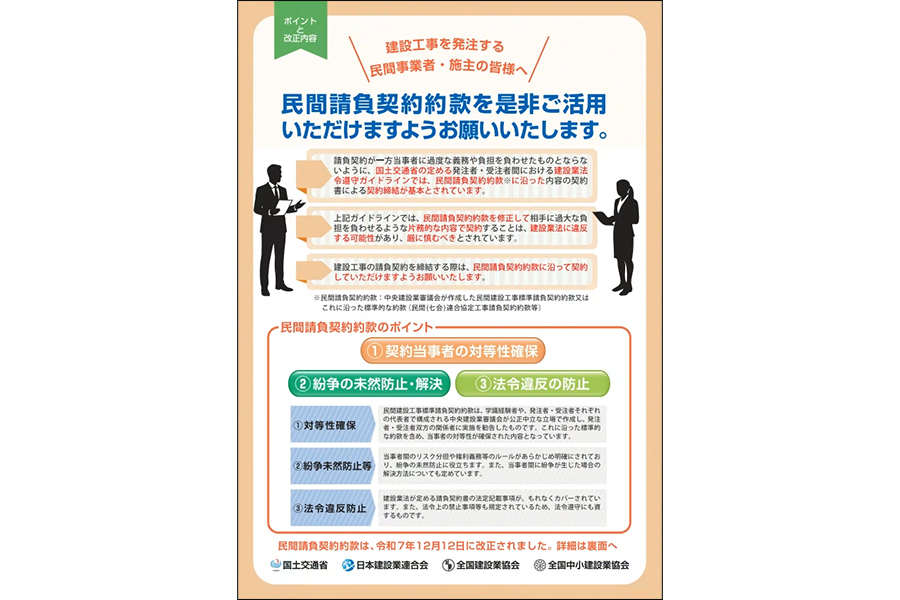 国土交通省、日本建設業連合会、全国建設業協会、全国中小建設業協会は、民間工事の契約に際して「民間請負契約約款」の利用を促進するリーフレットを共同で作成した。同リーフレットを活用し、建設工事を発注する民間事業者と施主に対して理解と協力を求めていく。